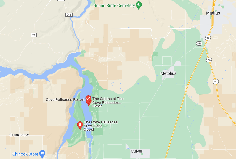 Cove Palisades on Lake Billy Chinook is located 12 miles from Madras Oregon, 23 miles from Redmond Oregon, and 42 miles from Bend,Oregon.